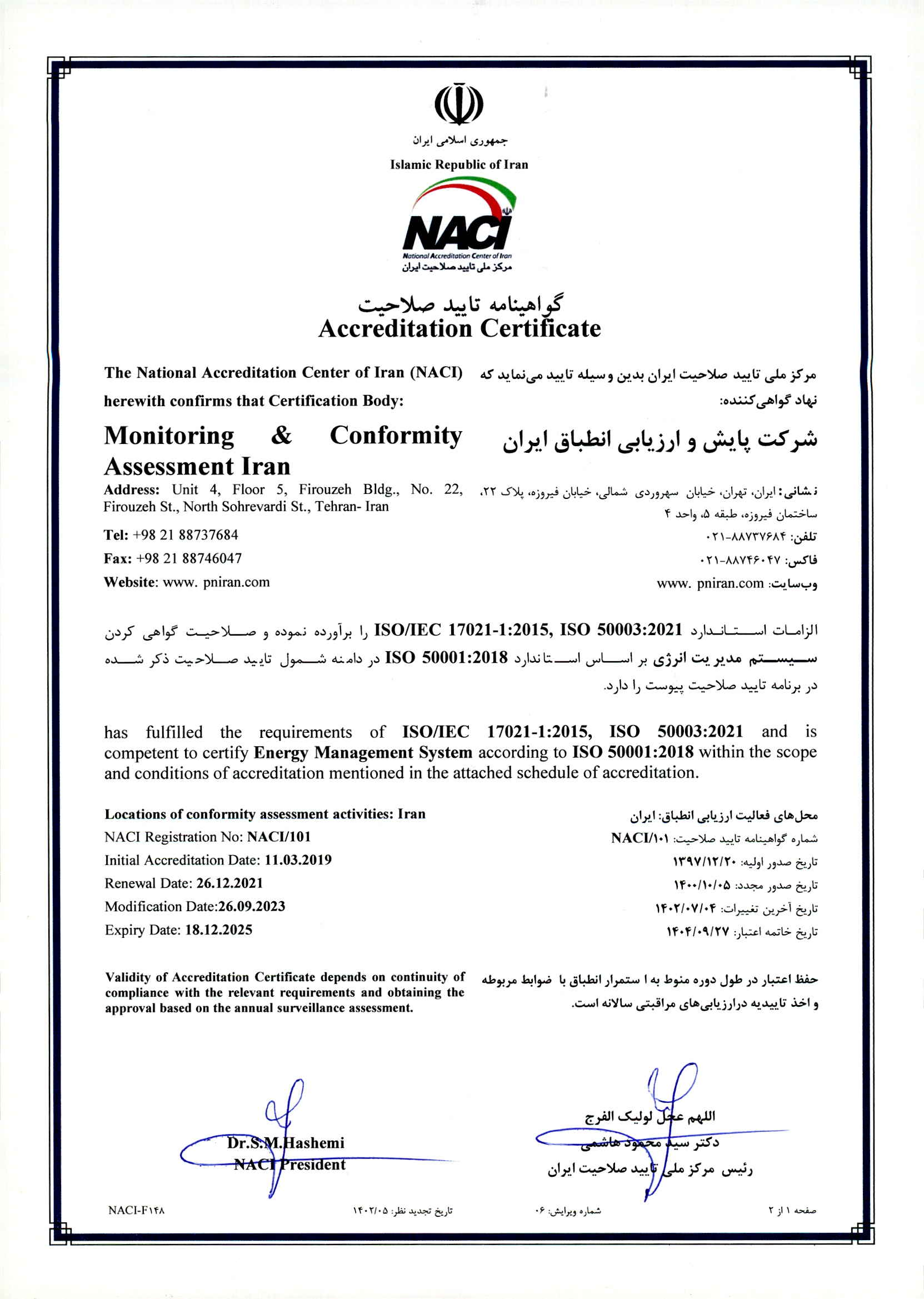 | 2 | تعیین معیار مصرف انرژی در صنایع | 1396/09/23 | مرکز ملی تایید صلاحیت ایران (NACI) |
