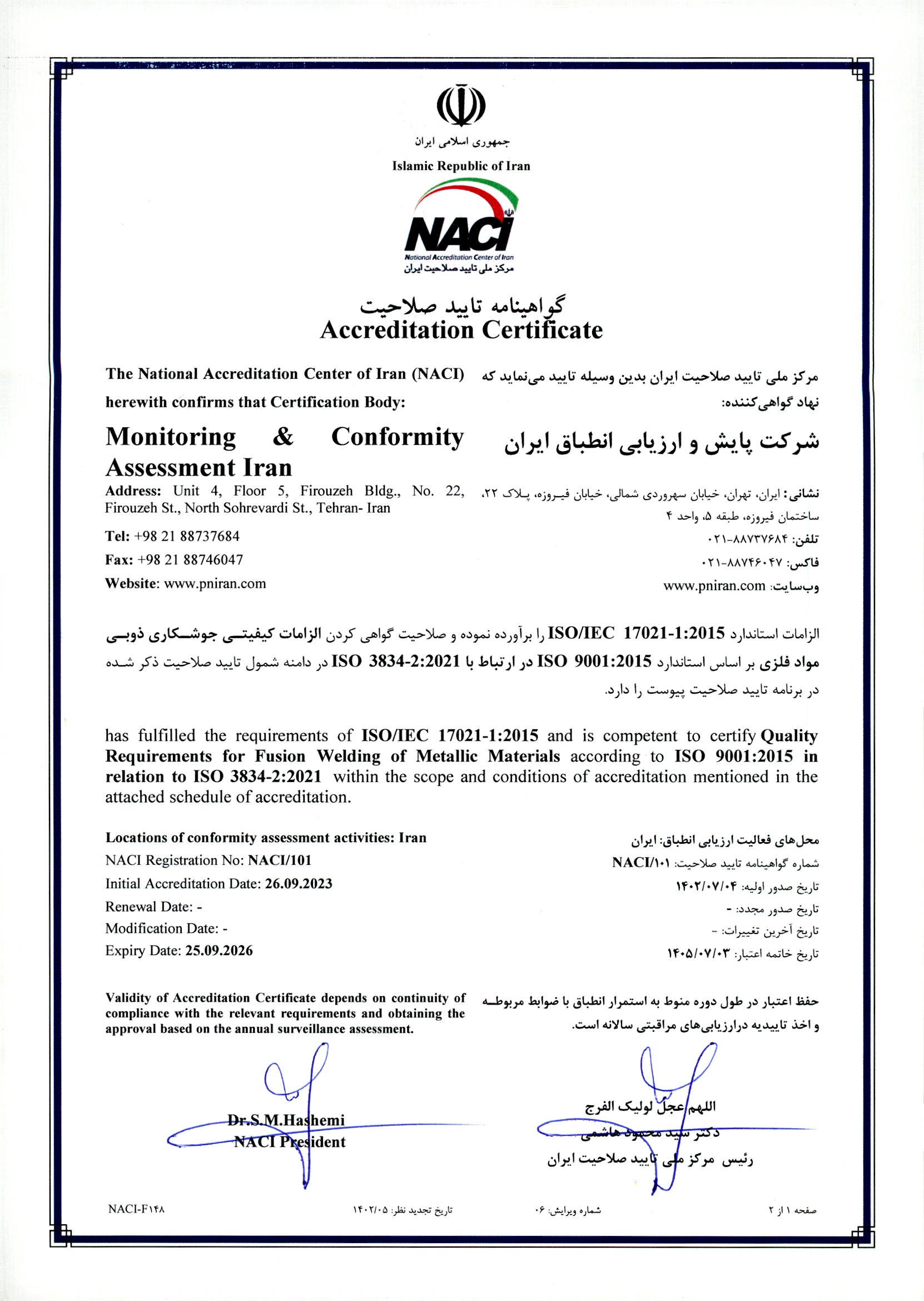 | 4 | صدورگواهینامه سیستم مدیریت کیفیت بر اساس استاندارد ISO 3834 | 1405/07/03 | مرکز ملی تایید صلاحیت ایران (NACI) |